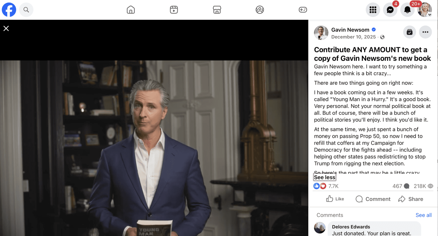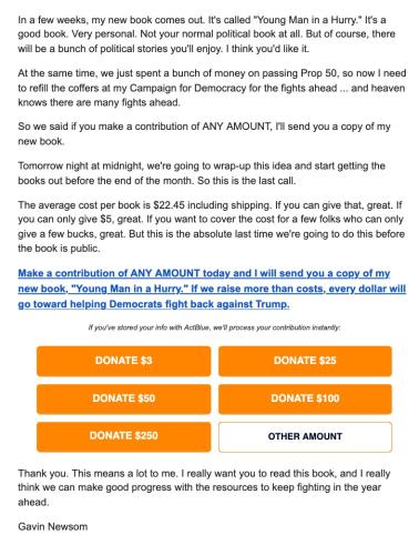 He offered a “free” copy of the memoir (average cost ~$22.45 including shipping) to anyone who donated any amount—even $5—to his PAC, according to Gavin Newsom’s Facebook post.